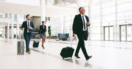 Airport, business travel and person with group, commuting or attorney with luggage, journey or case. Walking, team and lawyer on international trip for trial, abroad or opportunity for career growth