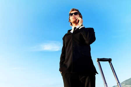 Handsome business man standing on a highway with his suitcase and calling by phone.