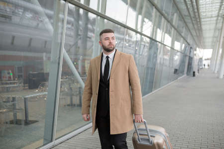Caucasian bearded tourist businessman walks public transport building with luggage on urban background a city street. Man in formal suit trip. Business traveler pulling suitcase in airport terminal