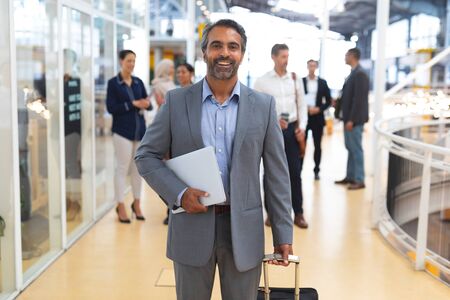 Front view of Happy caucasian businessman holding laptop and trolley bag and looking at camera in a modern office. International diverse corporate business partnership concept