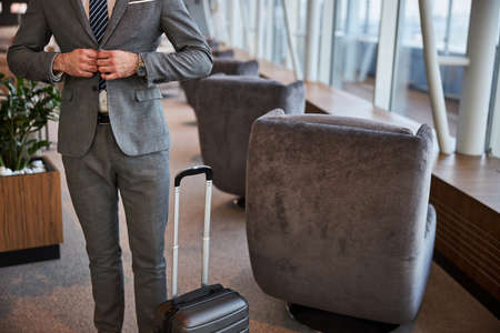 Cropped photo of an adult buckling the buttons on his suit with his rolling bag at his side