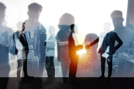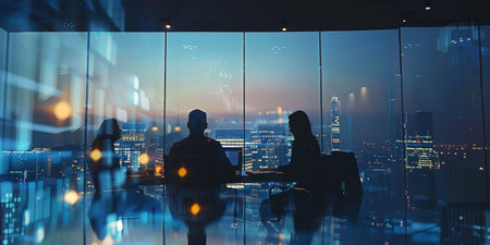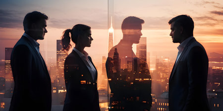 Silhouettes in a Corporate Meeting with a Cityscape Background. High quality photo