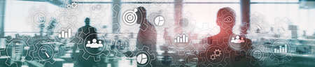 Business process abstract diagram with gears and icons. Workflow and automation technology concept. Website header banner.