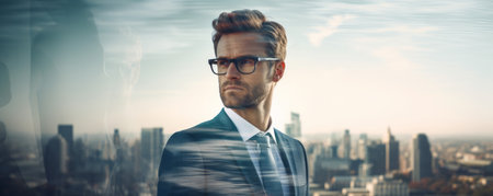 Corporate businessman double exposure portrait with modern city background