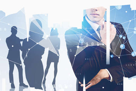 Unrecognizable thoughtful young businessman and his diverse team work in blurry abstract city with double exposure of immersive network interface. Concept of technology and communication. Toned image