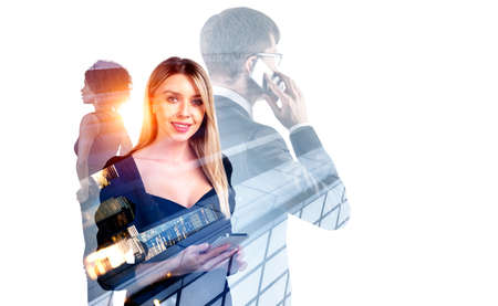 Young attractive businesswoman wearing formal wear is working together with colleagues at New York city skyscrapers downtown. Concept of teamwork, cooperation and making business deals in megapolis
