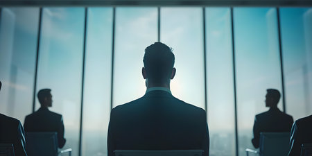 Silhouettes of business people meeting in conference hall. Businessmen teamwork planning strategy in office. Created with Generative AI