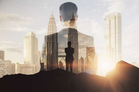 Back view of successful businessman on mountain top. Leadership and future concept. Abstract city background with sunlight and silhouette. double exposure