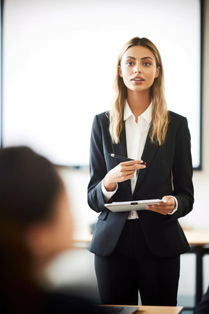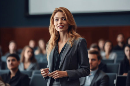 shot of a young woman giving a lecture in front of her colleagues, created with generative ai