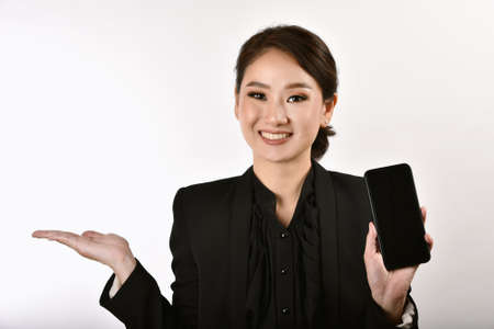 Business asian woman hand hand open presenting product for mock-up advertising, Portrait of happy smiling girl holding smartphone.