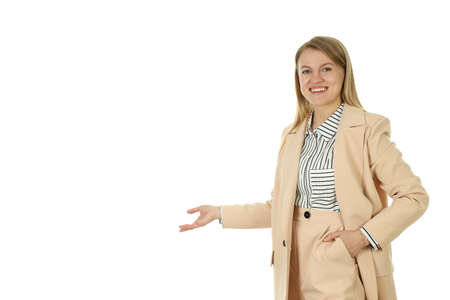 Business Concept. Beautiful businesswoman poses confidently. Beautiful young businesswoman looks charming and trustworthy. Young businesswoman has leadership on a white background.