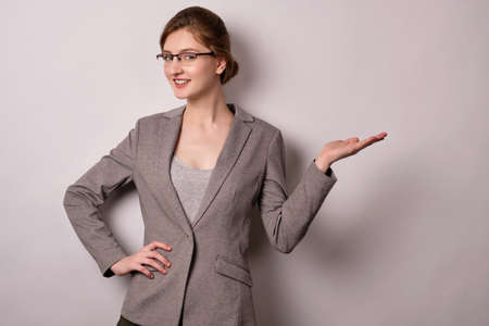 A girl in a gray jacket and glasses stands on a white background, looks at the camera, pointing his palm to the side.