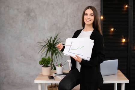 Happy woman smiling showing growth diagram, satisfied with financial and economic growth of his business, on office