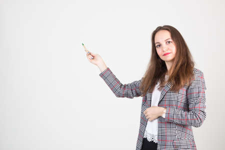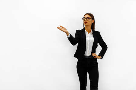 beautiful young woman in business formal clothes poses against a white wall and points at something