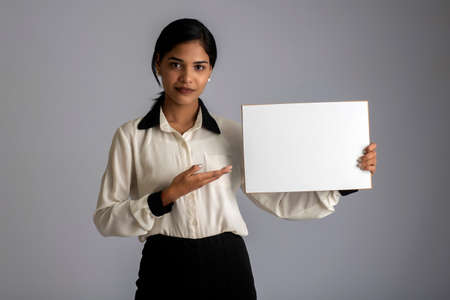 A young woman or businesswoman holding a signboard in her hands on a gray background.