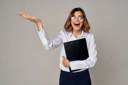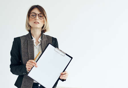 Business woman with a folder of documents on a light background cropped view and shirt suit