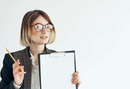 Business woman wearing glasses documents work blank sheet advertisement