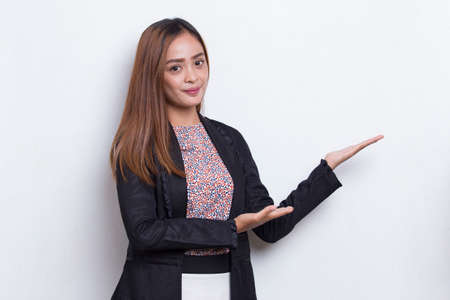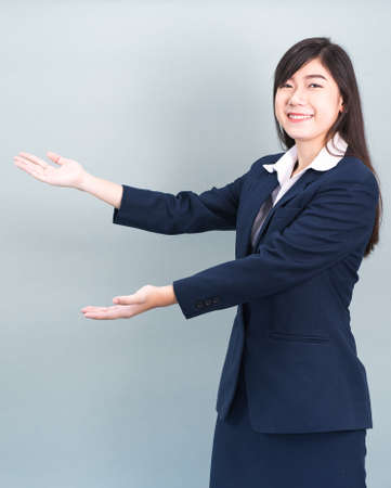 Asian woman in suit open hand palm gestures with empty space isolated on gray background