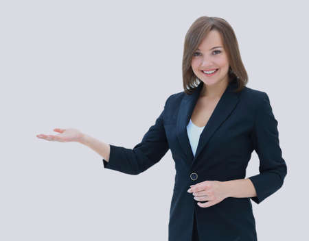 Cheerful young businesswoman showing presentation text Add your own text here