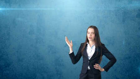 A cute businesswoman smiling in a blue dress invites you to pass, symbolizing her hands. Demonstrates the object with his hands Isolated on a gray background