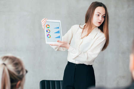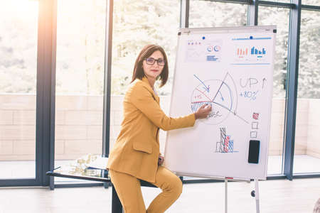 young emotional attractive girl in business-style clothes working with flipchart in a modern office or audience alone