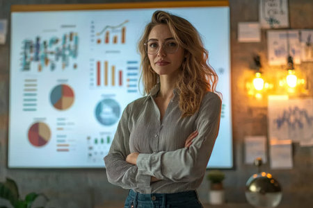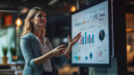 A businesswoman giving a presentation with a digital screen behind her, explaining complex data to her team.