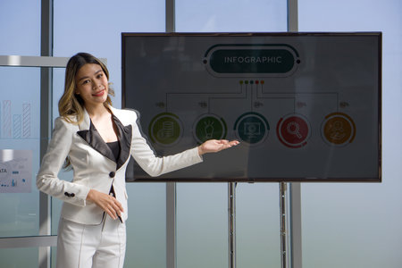 Young asian businesswoman in white suit giving presentation with large digital monitor.
