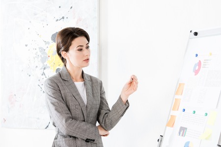 attractive businesswoman in grey suit looking at flipchart during project presentation in office