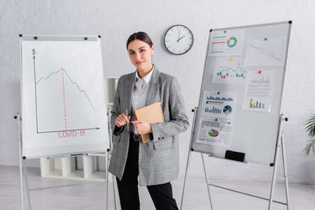 Young businesswoman in earphone with pen and notebook looking at camera near flipchart with graphs