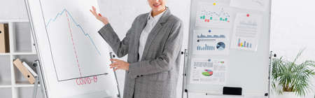 Cropped view of smiling businesswoman pointing at flipchart with lettering, banner