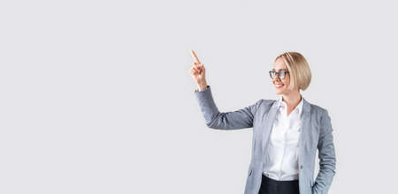 Portrait of smiling businesswoman in suit pointing finger at copy space isolated on white background.