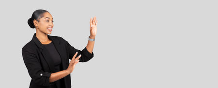 Confident African American businesswoman presenting with her hand, dressed in a professional