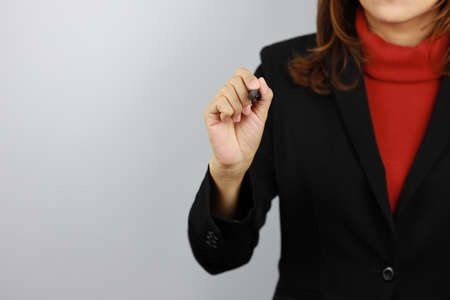 Business woman wearing black and red business suit uniform holding pen and drawing something with confident on white background studio (business growth advertisement concept)