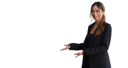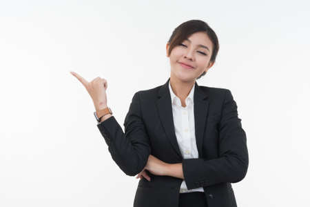 Business young asian girl is Happy and smile face with hand point on empty space.
