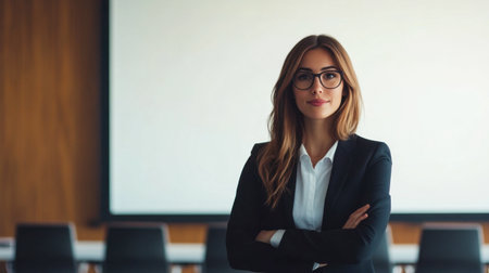 Portrait of young successful businesswoman standing with arms crossed and looking at camera while standing at boardroom