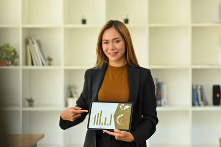Portrait with Asian Businesswoman showing detail business graph on digital tablet.