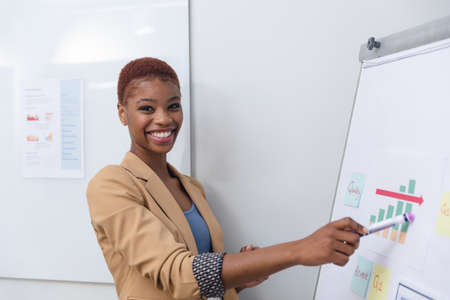 Portrait of smiling african american young businesswoman explaining strategy on flipchart. Unaltered, creative business, workplace, chart, graph, business plan, growth, infographic.