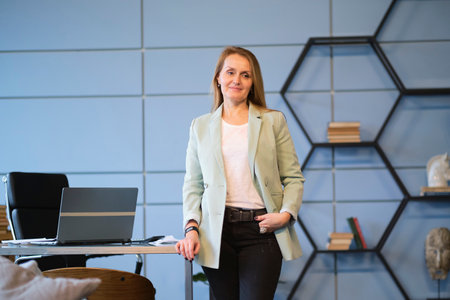 Confident female realtor discusses property options in stylish office setting
