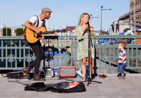 Stockholm, Sweden - August 19, 2015: Two street musicians on the bridge Stallbron in Stockholm with an interested little boy from the audience.