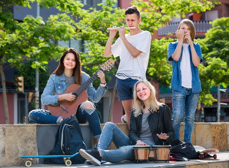 Cheerful girls and boys teenagers friends with musical instruments together outdoors