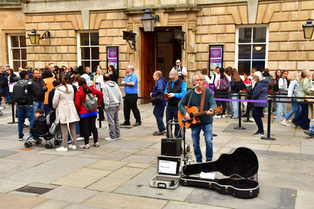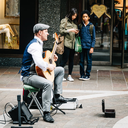 LONDON, UK - AUGUST 20, 2015: Street musician plays acoustic guitar near the entrance of Harrods while some people are listening. Dozens buskers perform on the streets of London.