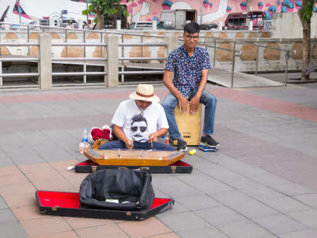 Saphan Taksin Pier BANGKOK,THAILAND-16 AUGUST 2018: Two musicians are playing music for a donation. on,16 AUGUST 2018, in Thailand.