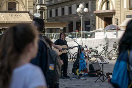Florence, Italy - 22 April, 2018: street musician on Piazza della Repubblica playing guitar