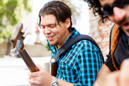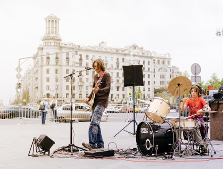 Moscow, Russia - May 08, 2019: Two street musicians playing rock music