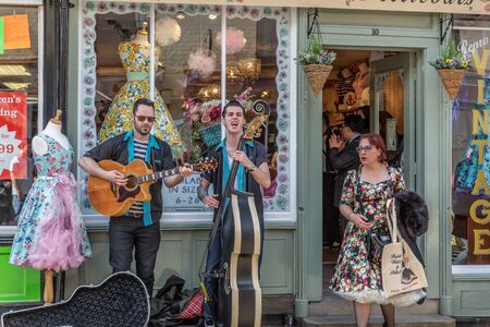 BURY ST EDMUNDS, ENGLAND - MARCH 23: Group of rockabilly singers in the street in front of a vintage clothing store on March 23, 2016 in Bury St Edmunds, England