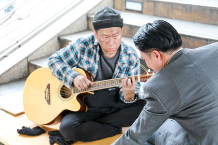 Old beggar or Homeless dirty man aritst hold donate bowl to ask for money with guitar and paper cardboard with help text to ask for donation. Poverty in town
