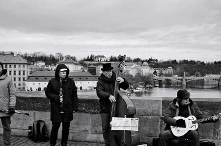 Prague, Czech Republic - 01 January 2020: street musicians are playing jazz music on the Charles Bridge