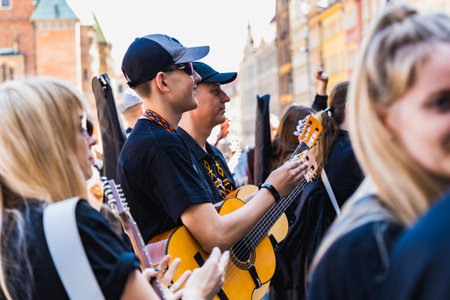 Wroclaw, Poland - May 1 2023: Participants with guitars at open event Guitar Guinness World Record 2023 where record was beaten with 7967 guitars at market square