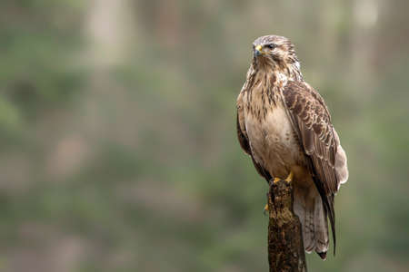 A beautiful Common Buzzard (Buteo buteo) sitting on a fence post at a pasture looking for prey. North Brabant in the Netherlands. green background.