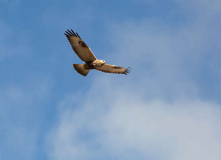 Beautiful adult buzzard eagle, Buteo buteo, in flight with cloudy blue sky background. Flying bird, vibrant colors and space for text